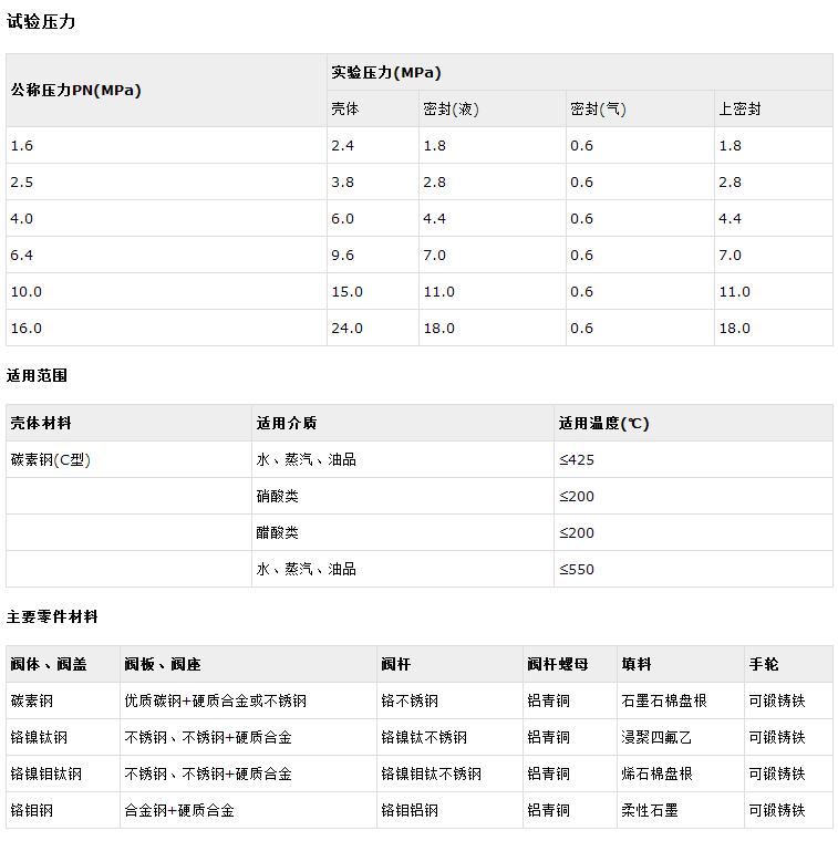 結(jié)構(gòu)型式:彈性楔式單閘板、剛性楔式單閘板和雙閘板型式。 廣泛適用于石油化工,火力發(fā)電廠等油品、水蒸汽管路上作接通或截?cái)喙苈分薪橘|(zhì)的啟閉裝置。 主要性能規(guī)范