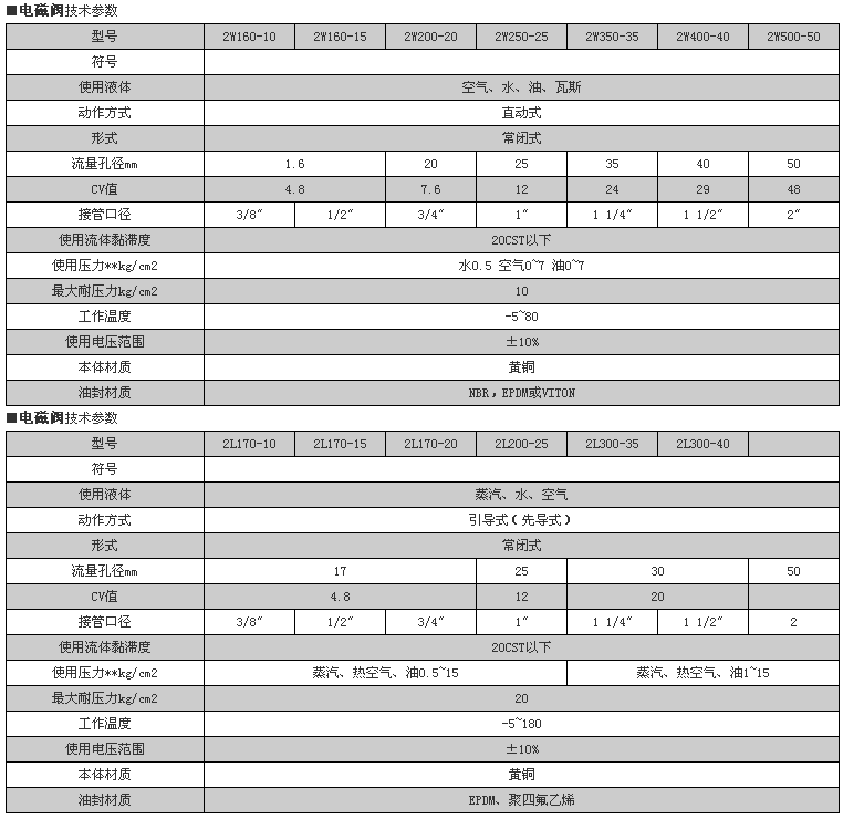 2W系列電磁閥,閥體采用鍛壓成型,內(nèi)件不銹鋼制作,用于管路中對(duì)液體,氣體介質(zhì)通斷的自動(dòng)控制。兩口兩位直動(dòng)式電磁閥,斷電打開(kāi),通電關(guān)閉閥體材質(zhì)為銅,最大耐壓使作壓力:17kgf/cm2環(huán)境溫度:0℃~65℃產(chǎn)品系列化生產(chǎn),體積小,流量大,適用范圍廣按閥上所表流向箭頭,可任意安裝;為增強(qiáng)使用壽命,最好線圈向上,水平安裝。